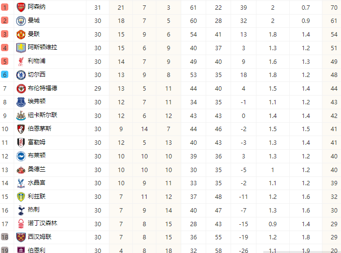 英超联赛第30轮已经结束了大部分比赛的交锋,其中英超排名上游以及属于豪门的球队都已经完成了本轮比赛,在本轮比赛结束之后,积分榜的排名没有很大的变化,http://www.wellbet520.com/ 不过排名榜首的阿森纳凭借本轮比赛的胜利以及竞争对手曼城的丢分进一步扩大了领先优势,球队目前争夺英超冠军的机会比较大。另外,曼联也是进一步巩固在欧冠区的主动权,而热刺在获得分数之后依旧面对较大的保级压力。
