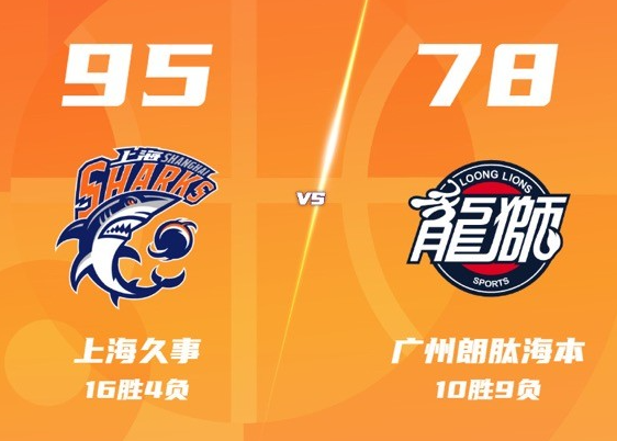 CBA联赛战报:上海大鲨鱼主场95-78轻松战胜广州乐福顿(乐福顿30+10,王哲林25+10)